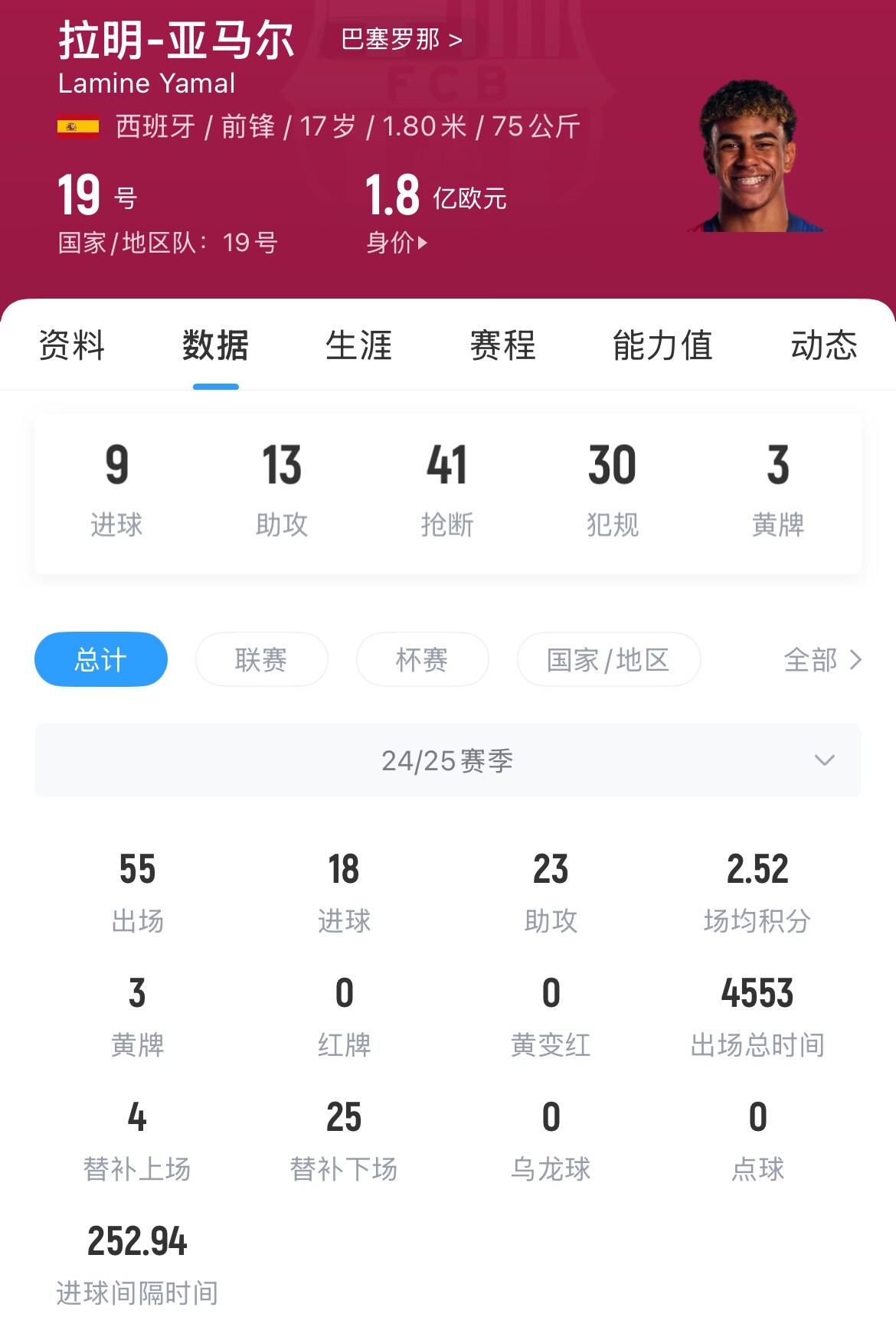 金年会金字招牌信誉至上本赛季17岁的亚马尔表现出色,为巴萨出场55次,打进18球、助攻23次,帮助球队拿下西甲冠军、西班牙国王杯冠军以及西班牙超级杯冠军。目前其德转身价已达1.8亿欧元。